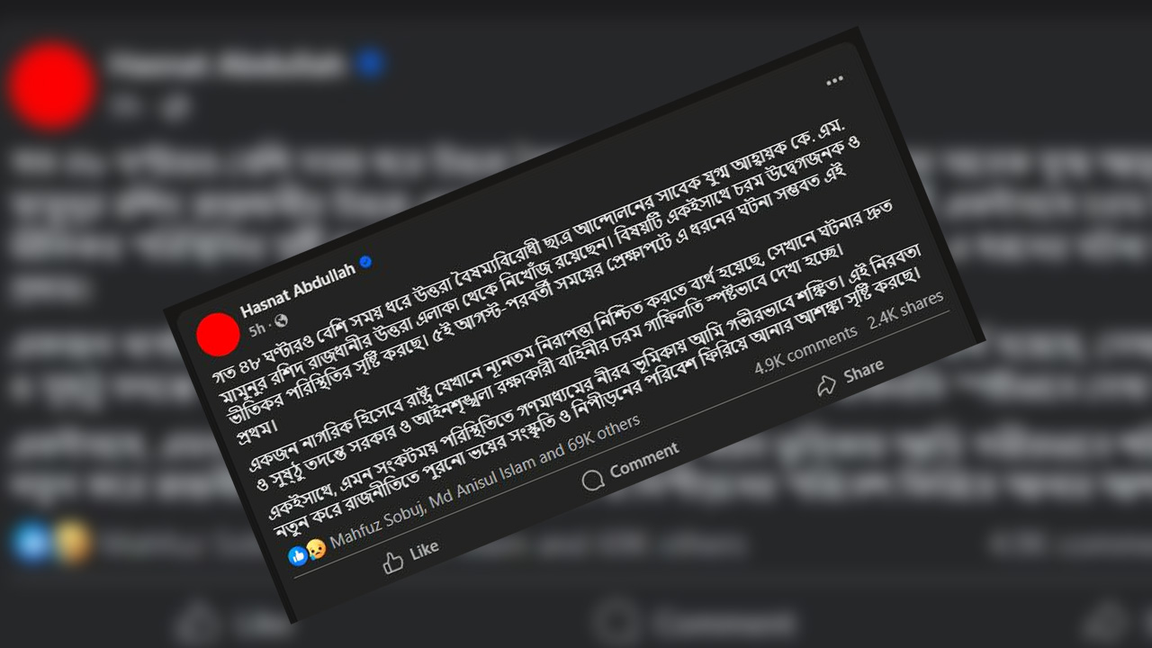 তিনি আরো লেখেন, ‘একজন নাগরিক হিসেবে রাষ্ট্র যেখানে ন্যূনতম নিরাপত্তা নিশ্চিত করতে ব্যর্থ হয়েছে, সেখানে ঘটনার দ্রুত ও সুষ্ঠু তদন্তে সরকার ও আইনশৃঙ্খলা রক্ষাকারী বাহিনীর চরম গাফিলতি স্পষ্টভাবে দেখা হচ্ছে। একইসাথে, এমন সংকটময় পরিস্থিতিতে গণমাধ্যমের নীরব ভূমিকায় আমি গভীরভাবে শঙ্কিত। এই নিরবতা নতুন করে রাজনীতিতে পুরোনো।’