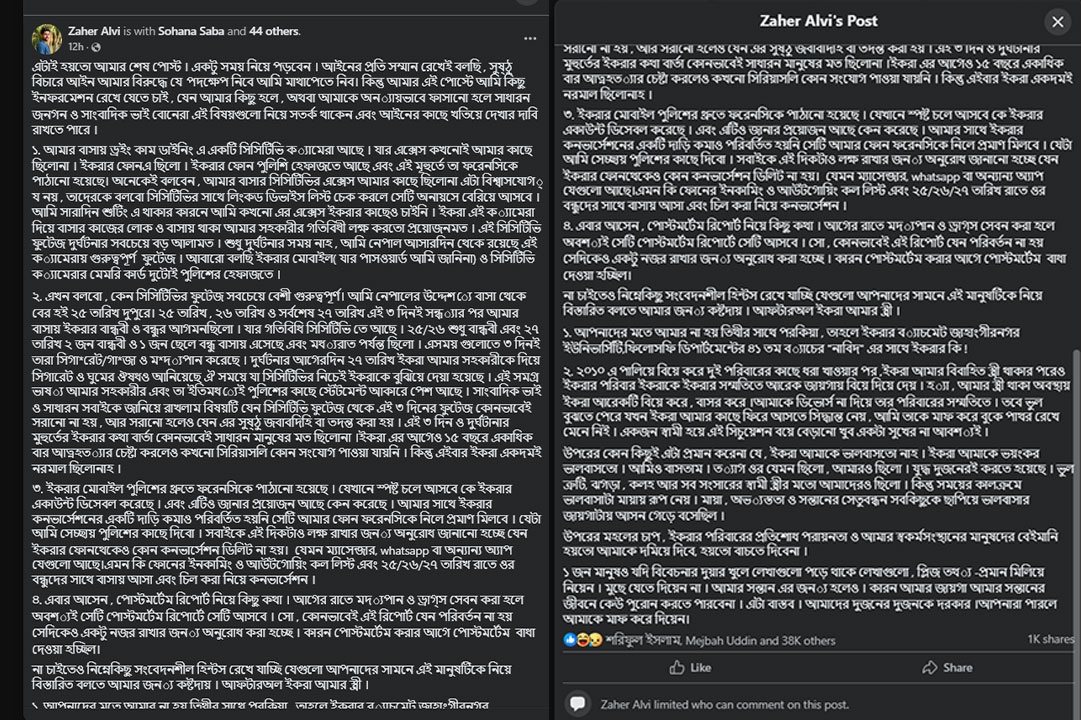 স্ত্রী আফরা ইভনাথ খান ইকরার মৃত্যুকে কেন্দ্র করে সামাজিক মাধ্যমে একটি দীর্ঘ ও চাঞ্চল্যকর পোস্ট দিয়েছেন আলোচিত অভিনেতা জাহের আলভী। ইকরার মৃত্যুর রহস্য উদঘাটনে বেশ কিছু তথ্য প্রকাশ করেন তিনি। তার দাবি, অন্যায়ভাবে ফাঁসানো হচ্ছে আলভীকে। শুধু তাই নয়, প্রয়াত স্ত্রীকে নিয়ে বিস্ফোরক দাবি করেছেন এই অভিনেতা।