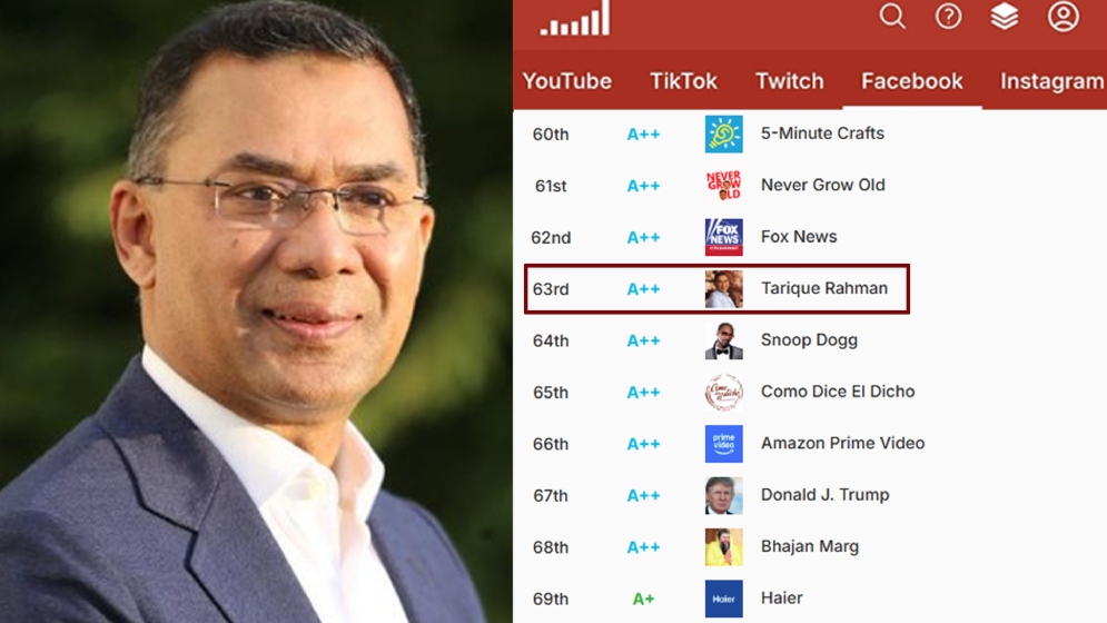 বিএনপির মিডিয়া সেল থেকে রোববার (১৮ জানুয়ারি) এক বিবৃতিতে জানানো হয়, কনটেন্ট পোস্টের সংখ্যা এবং জনসম্পৃক্ততার (এনগেজমেন্ট) বিচারে তারেক রহমানের অবস্থান বর্তমানে ট্রাম্পের ওপরে। সোশ্যাল ব্ল্যাডের তথ্য অনুযায়ী, তারেক রহমানের ভেরিফায়েড ফেসবুক পেজে বর্তমানে ৫৫ লাখ ৭৬ হাজারের বেশি লাইক রয়েছে এবং এর এনগেজমেন্ট বা আলোচনার মাত্রা প্রায় ১৬ লাখ ৪৮ হাজারের উপরে।